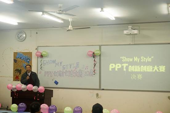 PPT兴趣小组指导老师任力、外国语学院荣鑫阁教授、传媒学院方龙共同担任赛事评委,共有19个团队入围此次决赛。 比赛开始前由外国语学院荣鑫阁教授致开场词,荣教授表示作为一个资深PPT爱好者能受邀作为本次比赛的评委十分荣幸,也希望同学们可以赛出风度、赛出水平、相互学习、共同进步。 主持人宣读比赛规则后,比赛正式开始。本次赛事以创新为主题,使得整个比赛妙趣横生。第一组创意而真实的《难》展示了整个PPT制作的过程,把生活写进PPT里,引起现场观众的共鸣;第五组自作自创的《LOL火柴人动画》充满了个性与独特,显示了参赛者扎实的专业技能;第十组在一片无声的世界里带来的《消失的绿色》引人深思;第十四组伟大而亲切《中国梦》使现场的观众倍感光荣与责任,为自己的国家而自豪,赢得了观众们激烈的掌声等等优秀的参赛作品无一不展示了同学们良好的创新能力以及积极学习的心态。最终,来自海角社区
