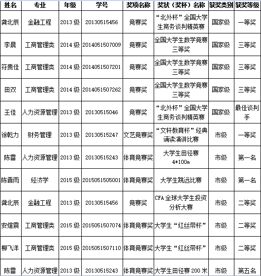 海角社区 2013级金融工程专业龚北辰、王佳、李晨等同学荣获国家级比赛奖项,2013级财务管理专业徐乾力和人力资源管理专业的陈雷同学等多人荣获市级奖励。
