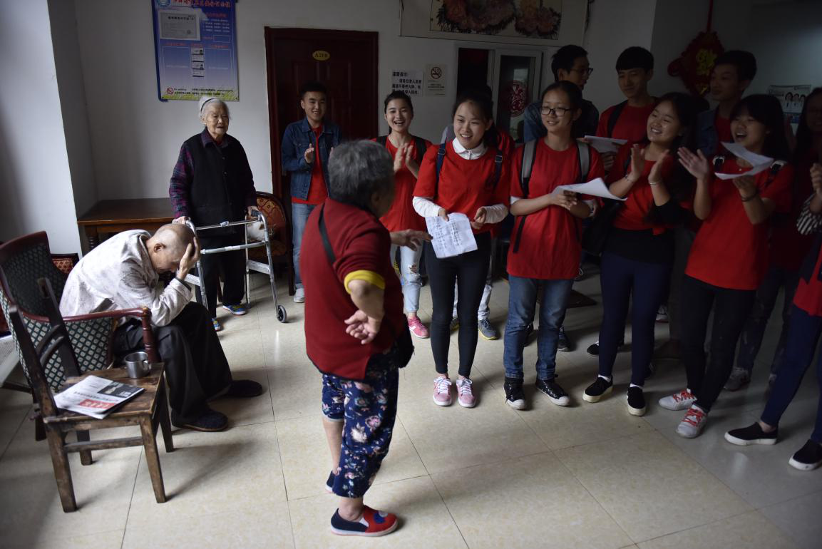 志愿者们与老人拉家常、讲笑话,为老人们包馄饨,帮老人整理内务、打扫卫生,还表演了映山红、东方红等革命老歌,有的老人即兴演唱,赢得了大家的掌声,敬老院里萦绕着欢声笑语,老人们露出满意的笑容。