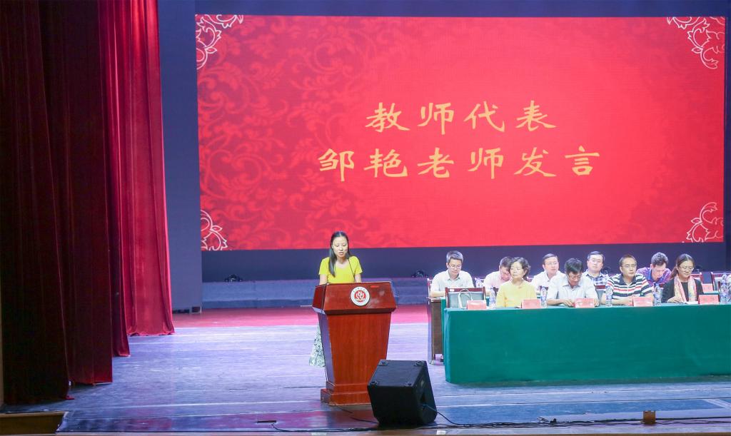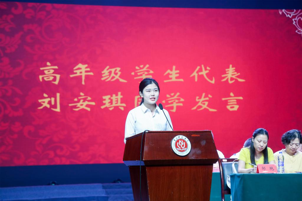 在观看完一组挥洒青春热血,彰显学子本色的军训照片后,开学典礼在庄严的国歌声中拉开序幕。田盈教授首先对2016级新生们的到来表示热烈欢迎,并对他们提出以下几点要求:一、不忘初心,方得始终,百炼成钢,九死不悔;二、合理规划时间,以学为重,捕捉灵感;三、要有期待,无懈怠,持之以恒。“‘态度决定成败’,在大学生活中要端正态度,做到学有所得,得有所用”是田盈教授对同学们的谆谆教导。紧接着,我校优秀教师代表邹燕在对新同学的到来表示热烈欢迎的同时也表示自己将在今后的生活中继续传承师道,厚德育人。新生代表刘新权展望大学生活,鼓励拼搏进取;高年级学生代表刘安琪同学也屡送真言,交流学习经验与心得。