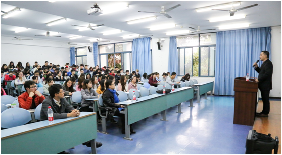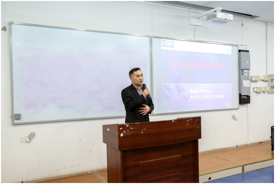 于弘德楼15204举行关于“如何应对公务员考试”的专题讲座,本次讲座由重庆市人才大市场监事会主席、管理学博士陈伙林先生主讲,税强书记主持。