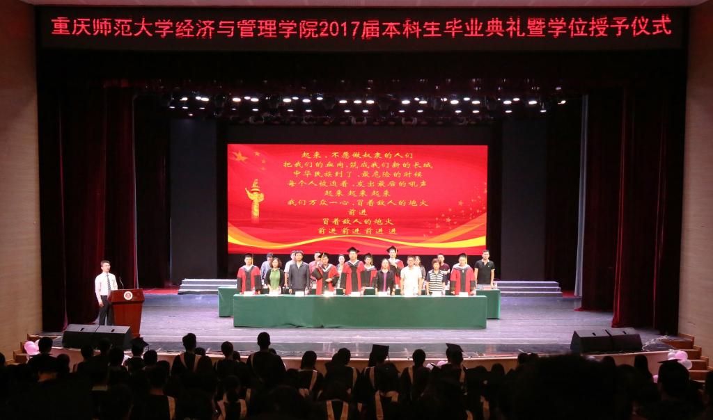 在播放完记录2017届毕业生在重师四年点滴回忆的暖心视频后,典礼在激昂的国歌中拉开了序幕。田盈院长上台致毕业贺词,田院长在祝贺即将告别母校、踏上人生新征程的2017届毕业生的同时,也对全体毕业生提出殷切希望:胸怀梦想,脚踏实地;直面困难,战胜挫折;志存高远,饮水思源。接着,陈道平副院长宣读了优秀优良毕业生以及升学深造同学名单,并对优秀优良毕业生代表进行了表彰。