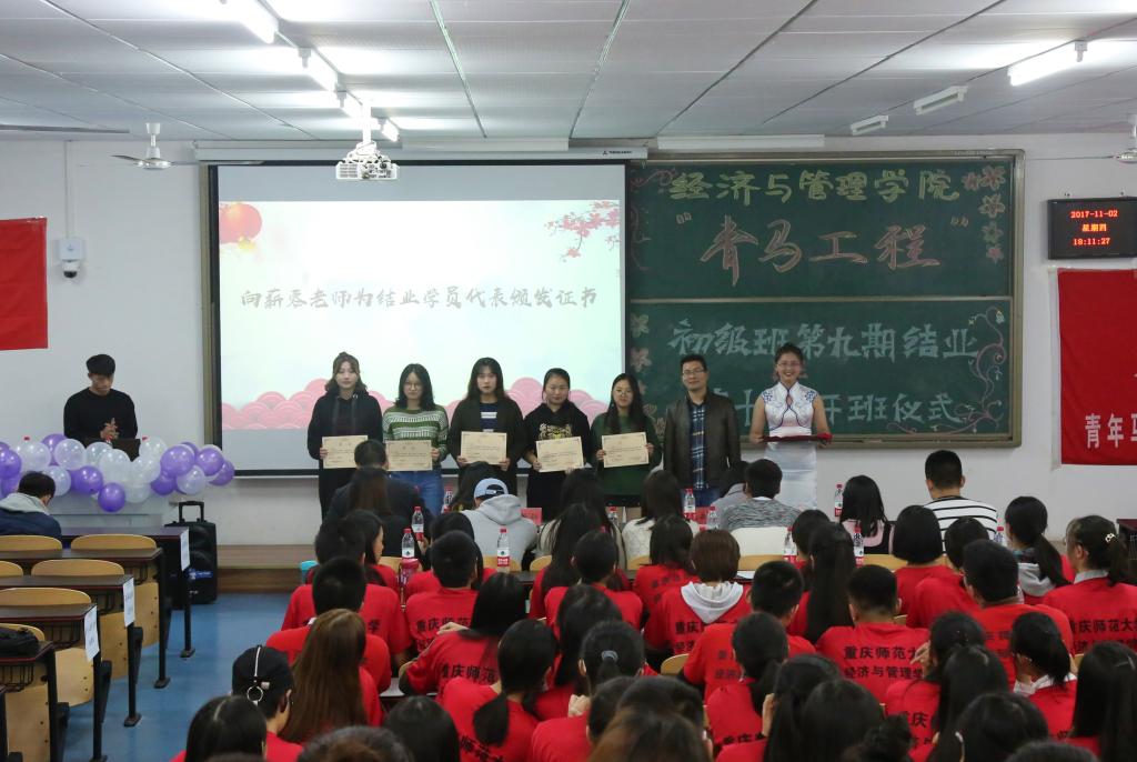 党委副书记任源钢为其颁奖。学院2015级辅导员唐爽老师宣读结业名单,学员代表梁玲上台发言,在场各位用掌声示以诚挚的祝贺。在热烈的掌声后,第十期初级班开班仪式正式开始,学院2017级辅导员张莉老师宣读第十期学员名单,2017级学员代表朱思雨发言。仪式尾声,第十期全体学员共同宣誓,表达对成为优秀马克思主义者的决心与信念,并由任源钢副书记总结陈词。任书记表示,青年强则国强,为建设富强、民主、文明、和谐、美丽新中国,实现中华民族的伟大复兴,每个青年人都应当不忘初心,牢记使命,砥砺奋进。