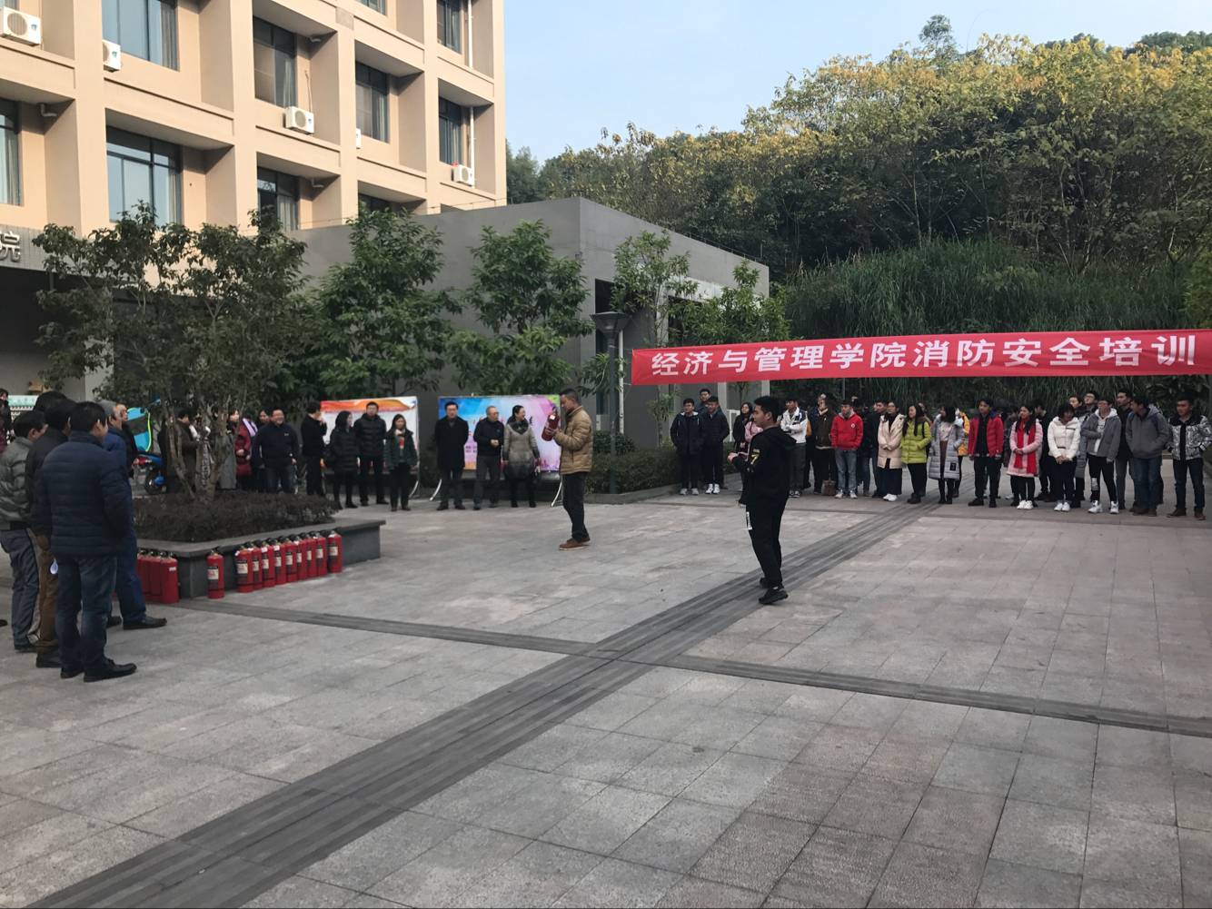 在消防安全知识讲座结束后,全体人员在汇贤楼外空地上进行消防实战演练。消防人员为全体人员演示高压水枪、灭火器等消防器材的使用方法、注意事项和急救常识。师生们参与其中,进行灭火器材实际操作。
