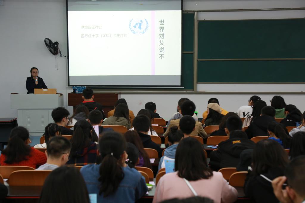 在励志楼2507室开展了防范艾滋病主题宣传讲座。本次讲座由工商管理专业2班的唐薄辰与经济学专业2班的付童戈主讲,在辅导员胡雪梅老师和柴风梅老师的组织下,海角社区