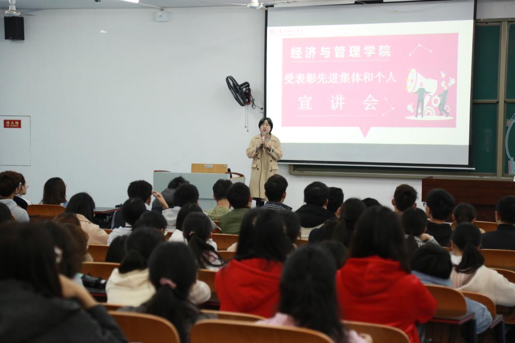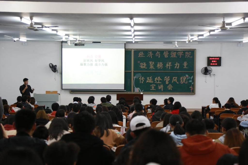 在T2507室举办“凝聚榜样力量,传延经管风貌”首场学生先进集体和个人宣讲会。学院党委副书记任源钢,团总支书记、学工办主任罗昭阳及辅导员柴风梅,2018级全体新生参加本次宣讲。