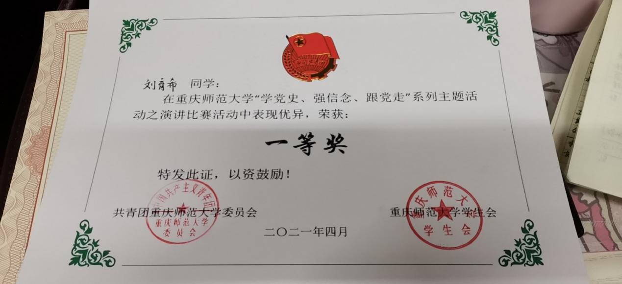 (刘育希荣获“一百人”演讲比赛一等奖)