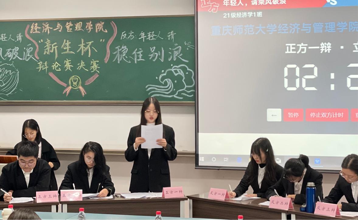 在立论、申辩、自由辩论三环节中,正方代表2021级经济学1班以时代角度入手,呼吁年轻人乘风破浪,反方代表2021级工商管理类5、6班从论点定义入手,以数据论证稳住别浪的重要性。最终反方代表略胜一筹,赢得此次辩论赛冠军,正方四辩杨子颖获“最佳辩手”称号。