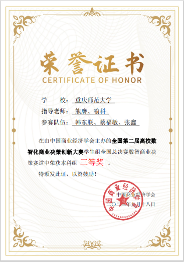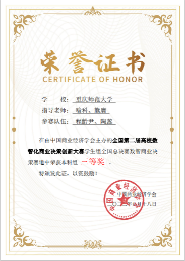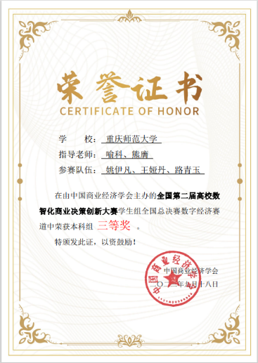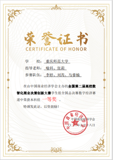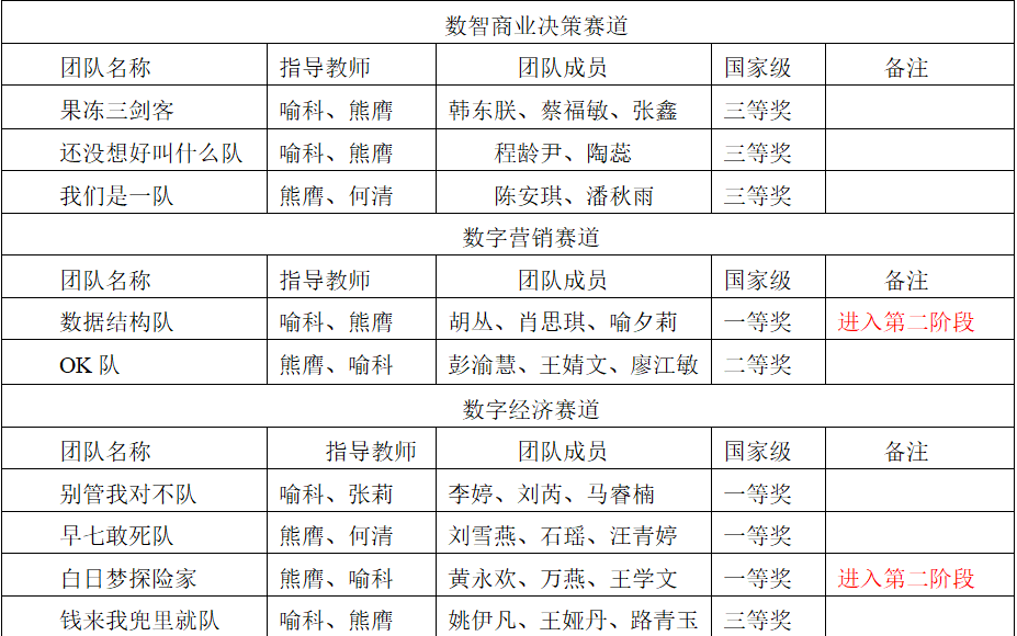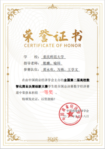 学生共获得国家一等奖4项、二等奖1项、三等奖4项。此项赛事分为三个赛道:数智商业决策赛道、数字营销赛道、数字经济赛道,根据竞赛晋级规则,决赛第一阶段竞赛成绩排名靠前的20支团队获得进入全国总决赛第二阶段“数智职业实战”环节,该环节以答辩形式进行,评委与参赛队伍双向匿名,抽签方式全程加密。海角社区