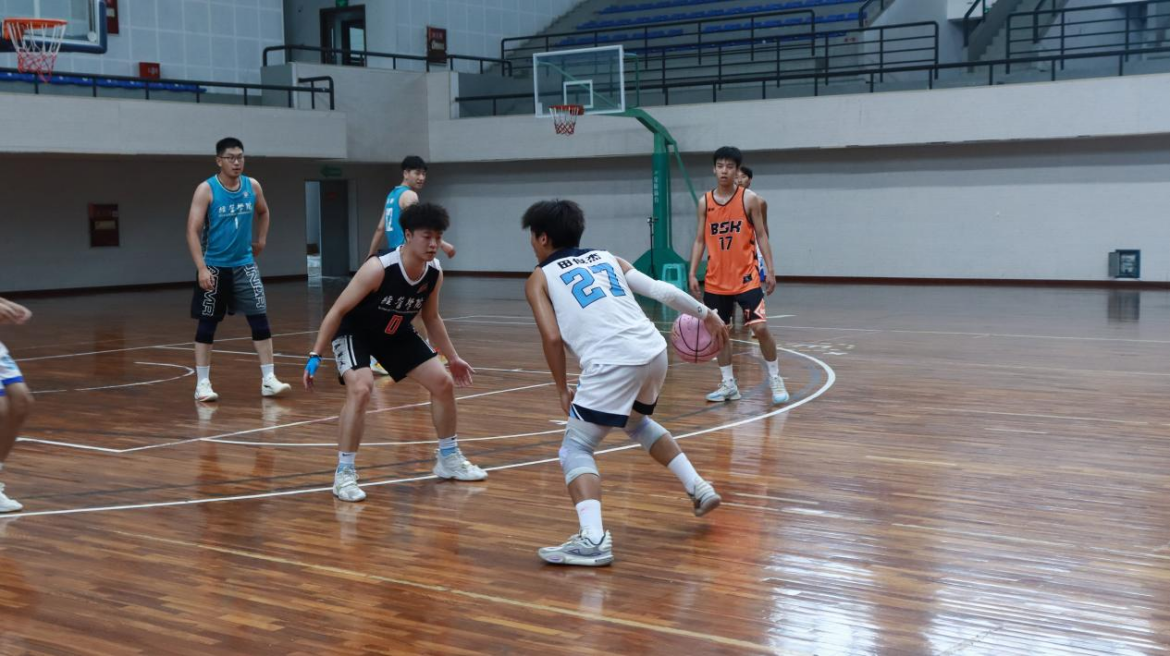 校友之间的篮球友谊赛。在2024年6月10日下午两点半,体育馆二楼篮球馆内,现役校篮球队与17级工商管理校友陈杰巍、张庆源,18级金融工程校友牟俊霖、张太校,19经济学校友李添靓、林恒奇组成的校友篮球队共同上演了一场激动人心的较量。