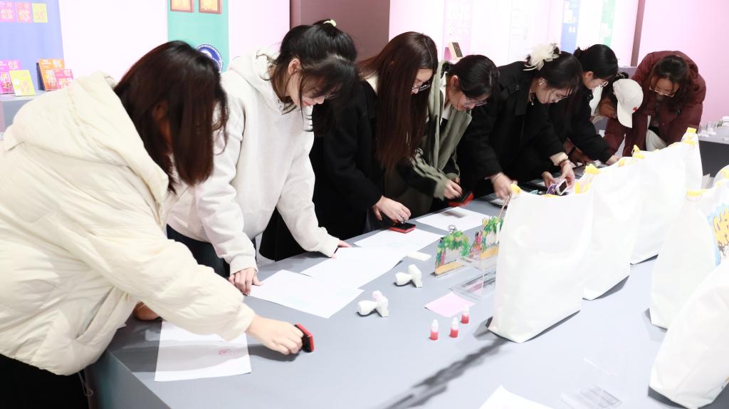在讲解员的细致解说下,同学们深入探索每件作品背后的创作灵感、艺术风格以及蕴藏的文化内涵。参观途中,同学们积极交流讨论,分享自己对不同作品的理解与感悟。步入最后一个展厅,各式各样的精美文创展品与风格迥异的印章映入眼帘。在讲解员的精心安排下,早已备好集邮本的同学们兴奋地逐一盖上印章,为这次参观之旅留下了独特而珍贵的记忆印记。