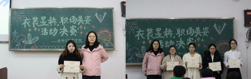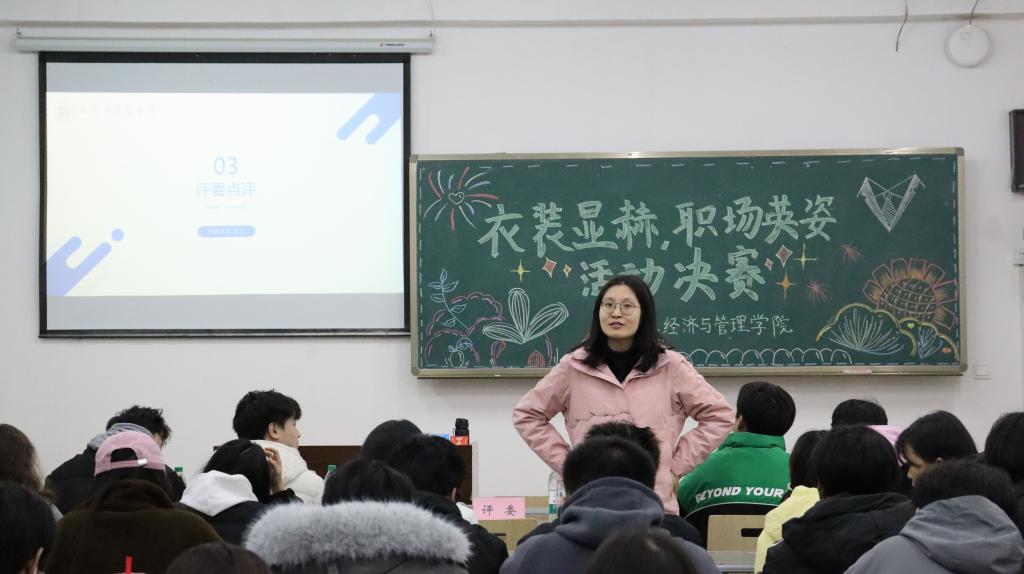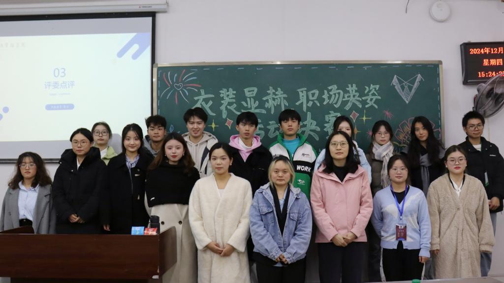 “衣装显赫,职场英姿”职场穿搭比赛决赛于砺志楼T2202举行。决赛邀请龚朝珍老师和地理与旅游学院航空服务艺术与管理专业的同学担任评委,7名选手参加决赛。