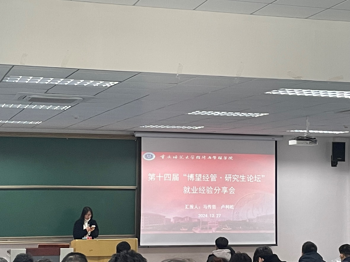 于求是楼213教室举办第十四届“博望经管·研究生论坛”就业经验分享会。本次分享会由经管学院2022级研究生卢柯屹、马传哲同学分享求职就业经验及心得,学院2023级全体研究生参加。