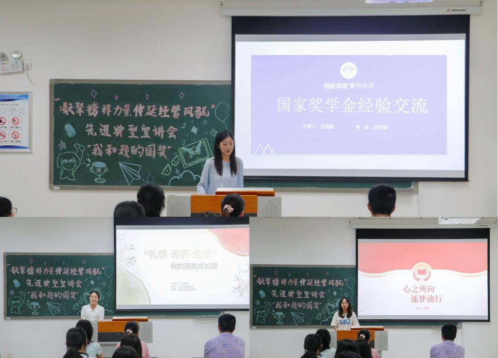 于求是楼215举办“凝聚榜样力量,传延经管风貌”先进典型系列宣讲会——“我和我的国奖”。本次活动邀请王雨熔、熊嘉英、谢君三位国家奖学金获得者担任分享人,海角社区
