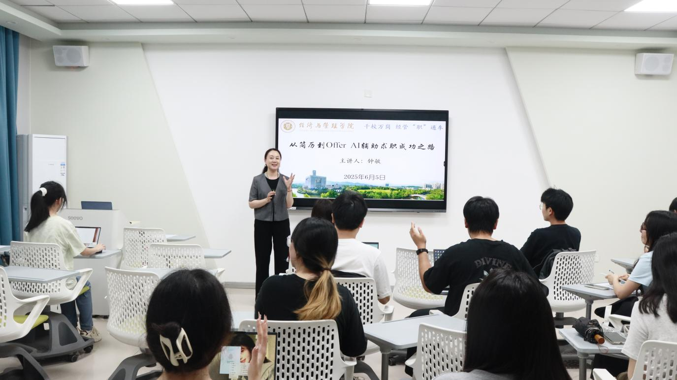 于求是楼124开展“从简历到offer,AI辅助求职成功之路”专题讲座。本次讲座由学院党委书记钟敏主讲,2026届毕业生积极参与。