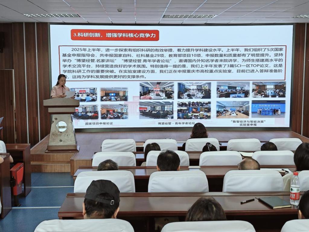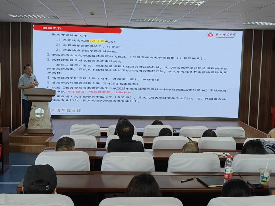 会上,学院党委书记钟敏代表学院党委作学期工作总结报告。报告指出学院在党建、教学、科研、学生管理等方面取得显著成绩。党建方面,深入学习贯彻党的二十大、二十届三中全会精神,推进提级巡察整改,强化纪律意识;教学上,完成本科教育教学审核评估,荣获重庆市高校教师教学创新大赛一、二等奖,修订完成人才培养方案,线上线下创新招生宣传等。科研上,申报国家基金项目29项,发表3篇SCI一区TOP论文,筹备申报重庆市高校重点实验室等。学生管理上,强化思想教育,保障安全稳定,2025届本科毕业生就业率达91.33%。暑期将持续推进巡察整改、开展数字化素养培训、筹备新文科实践创新大赛、拓展就业机会、组织暑期三下乡实践活动、支持教师学术交流等工作。未来,学院将持续加强党的建设,推进教学改革,加大科研创新力度,扎实做好学生工作,确保完成全年目标任务。