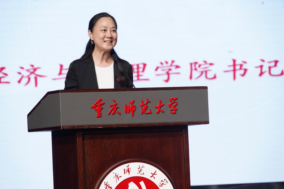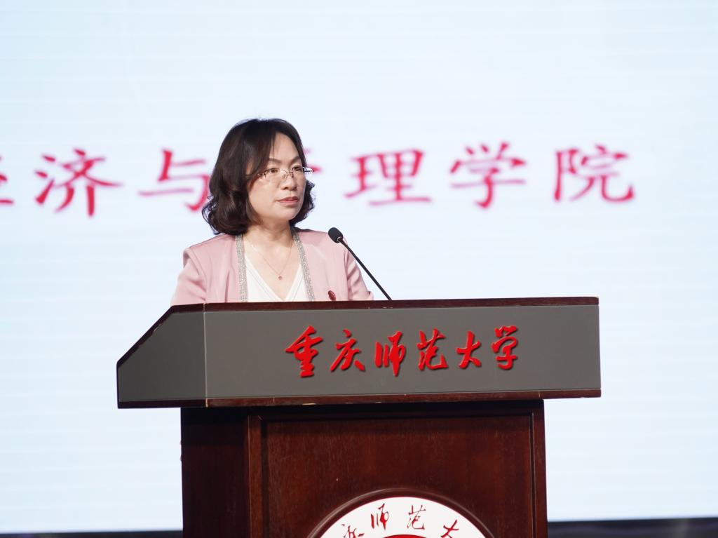 紧接着,执行院长郑景丽上台发言。她从师资力量与学科建设两方面简要介绍学院整体情况。目前,学院拥有一支结构合理、梯队完善的专任教师队伍,博士学历教师占比高,同时配备博士生导师、硕士生导师及校外导师,为研究生培养提供基础保障。学科建设方面,管理科学与工程是学校重点培育的申博学科,学院还设有多个专业学位授权点,其中农业硕士为重庆市重点学科。在介绍完学院核心发展基础后,郑景丽强调,研究生身份不仅是学业阶段的进阶,更意味着需具备敢于挑战、善于钻研、勇于探索的自觉与能力;结合当下科技革命与产业变革的时代背景,她进一步从潜心钻研厚植基础、坚持不懈永葆热情、交叉融合开拓视野、团结协作携手并进四个方面,与新生分享成长心得、寄予发展期望。