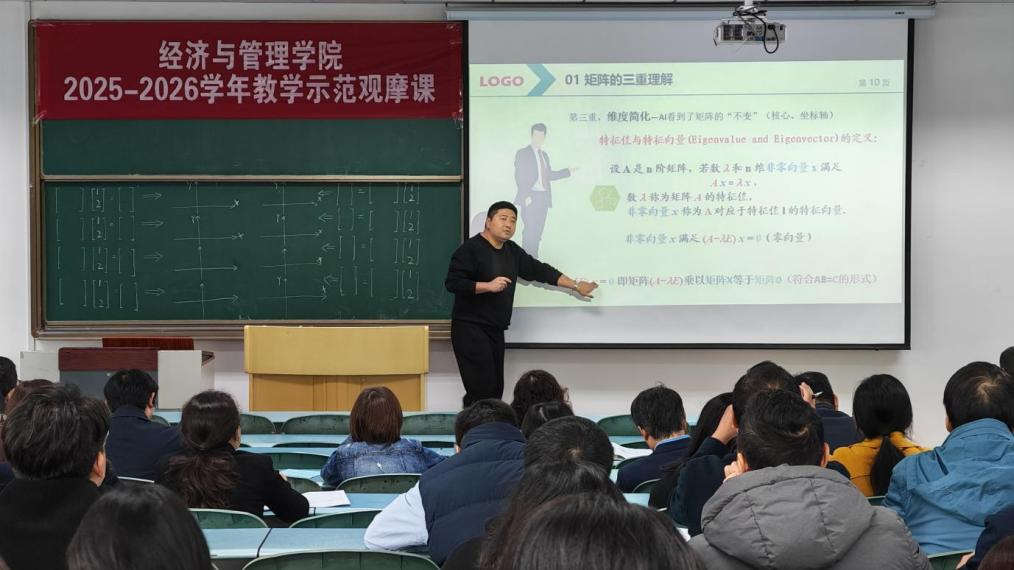 王现宁以《线性代数》中“2.3 矩阵及矩阵乘法到特征值特征向量:AI的秘密语言”为授课主题。他巧妙的从“人工智能如何看懂图片”这一热门话题切入,搭建起前沿科技与矩阵理论的关联桥梁,激发听众的探索兴趣。他围绕矩阵核心概念,通过图形分解、实例演示等方式,以直观视觉呈现将抽象理论具象化,帮助听众快速把握知识本质。吕潮林则以《产业组织理论》中“外卖‘三国杀’何以没有赢家—寡头垄断之伯特兰模型”为授课核心,紧密结合当下大众熟知的外卖行业竞争案例,将抽象的经济学模型转化为生活化场景,降低学习理解门槛。两位老师课程设计极具巧思,灵活运用案例分析、图形分解、课堂讨论、知识图谱、等多元教学方式组织教学,同时将课程思政元素自然融入知识点讲授与案例剖析中,既实现知识传授,又完成价值引领;整堂课吸引力强、气氛活跃,通过层层引导启发学生思考探索,讲授内容深入浅出,教学成效显著。