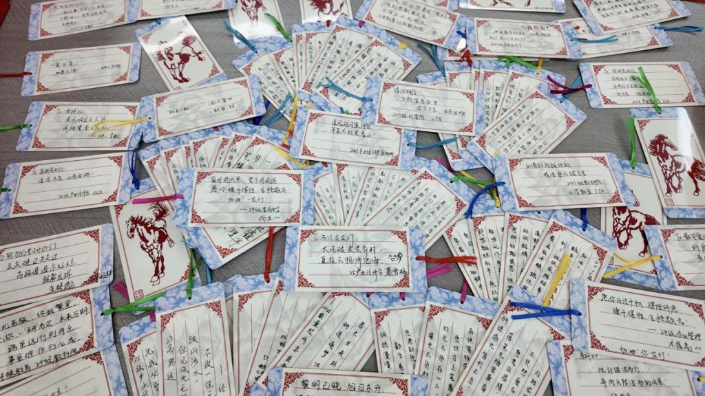 研究生们也通过手写明信片的方式为考研学子送上祝福。明信片背面印着的骏马剪纸图案,寓意着在即将到来的马年里,学子们能够“马到成功”。百余张卡片上,或书写励志诗句,或留下暖心寄语,一字一句都凝聚着学长学姐的备考经验与真诚祝愿,成为考研学子冲刺路上珍贵的情感陪伴。