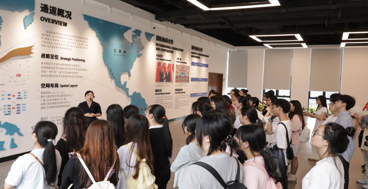 本次见习活动主要采取“参观体验+座谈交流”的形式。师生们首先参观了陆海新通道重庆无水港,这也是习近平总书记今年来渝考察调研的首站。在这里,他们看到了大货车进出和龙门吊起降的繁忙景象。随后,师生们来到陆海新通道展厅,通过讲解员的介绍,了解了西部陆海新通道在建设国际物流枢纽和推进区域发展中的重要意义。