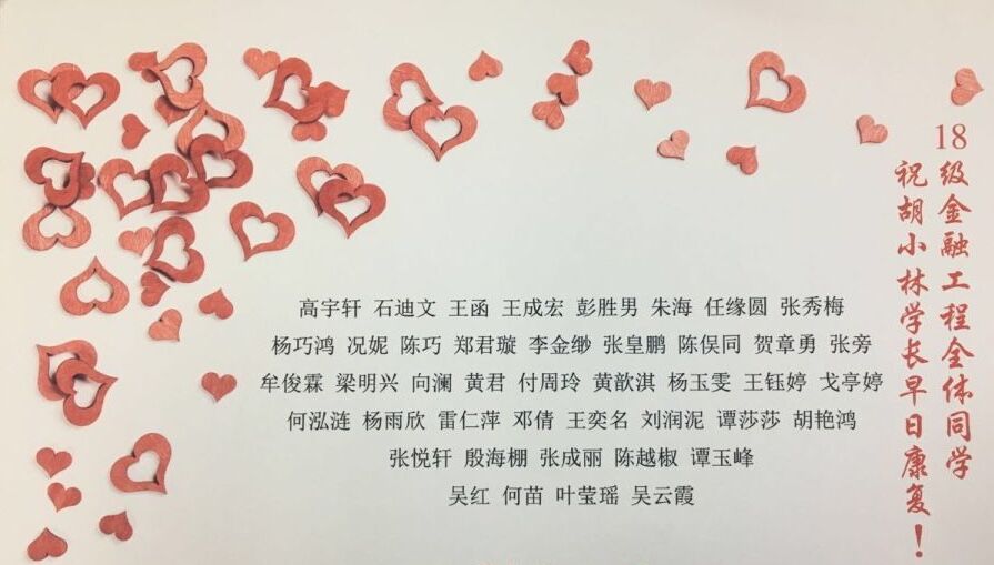在老师、同学以及社会各界热心人士的关心帮助下,胡小林同学已完成第二次化疗,学校、学院也将持续关注他的情况。面对各方的关心帮助,胡小林向学校、学院、老师和同学们以及社会各界热心人士的关心、帮助和支持表达感谢,自己一定会坚强起来,战胜病魔,早日返校学习。