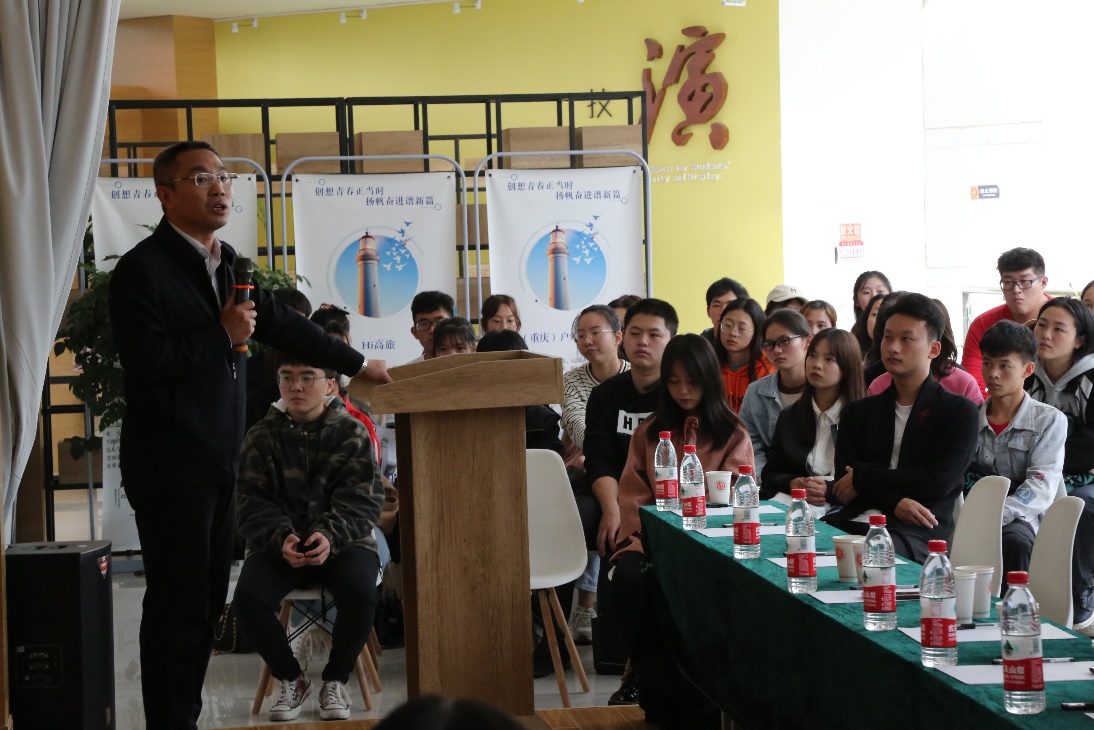 团市委副书记,海角社区 2002级校友江光伟首先发言,他结合自身经历就信念与信心、目标与坚持、遗憾与包容、学习与提高、忠义与厚道五个方面的内容给大家做了分享,勉励同学们面对艰难要咬牙坚持,逐步搭建人生基石,也表达了对学弟学妹们都能“立鸿鹄志,做奋斗者”的真诚期望。随后,重庆群荣电子科技有限公司副总2001级校友吴昊和重庆机电集团股份有限公司(风电公司)综合管理部部长2009校友田酸分别从校园和职场两个方面向大家分享了学习成长的经验和感悟,鼓励同学们好好利用大学四年学习专业知识、抓住机会磨炼自己,给自身增加“砝码”。