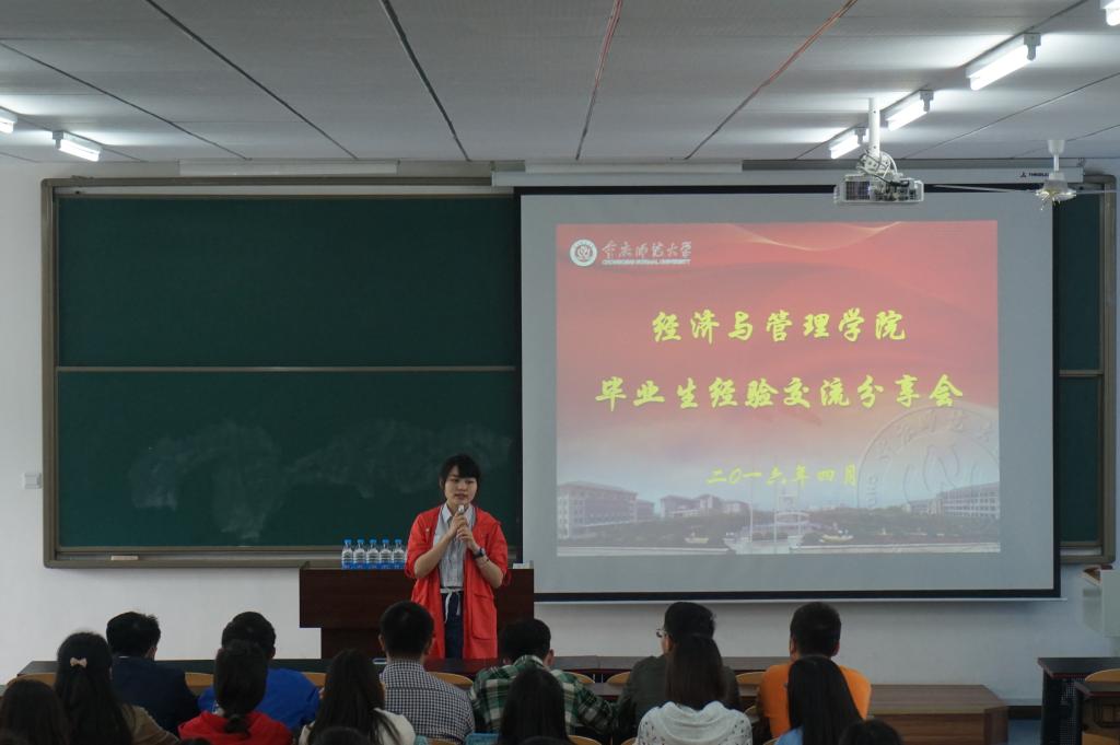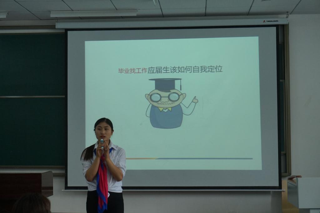 学生陈芬分享的关于她自己找工作时的一些经验方法作用甚多。她指出到场学生应该明确自己的目标与方向,着重培养自己的软实力,发展并提高自身综合能力,成就自我。