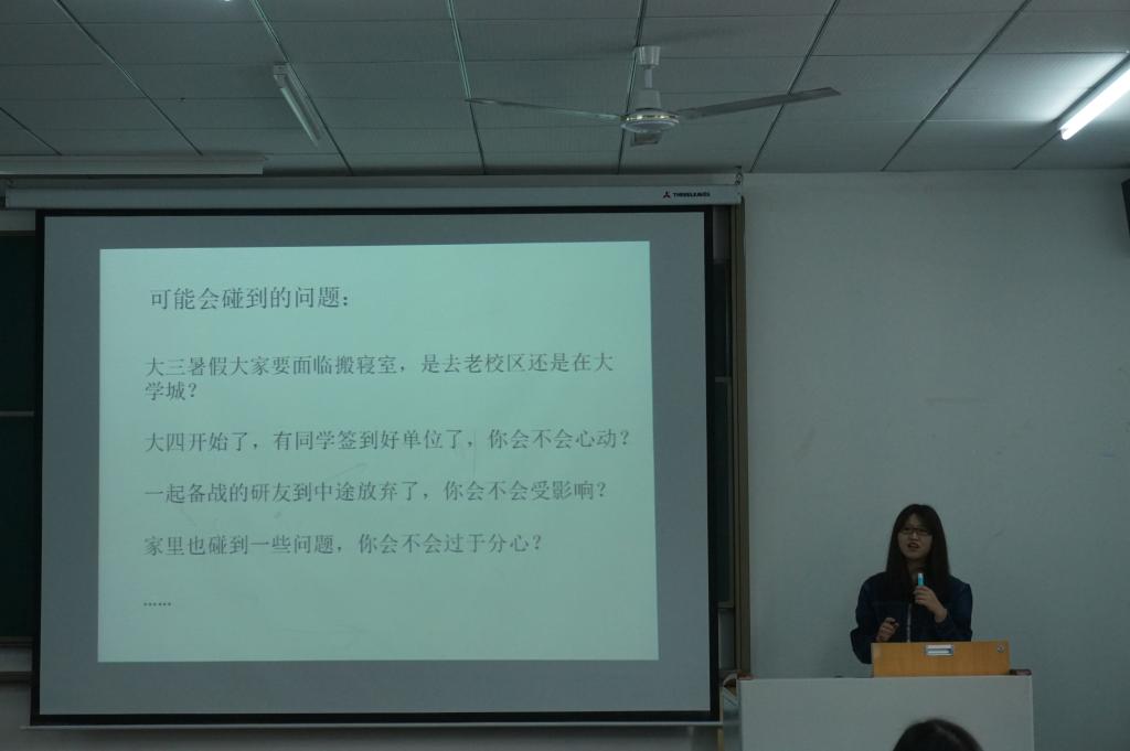 学生康梦楠、高盼、李诗昀分别结合自己的实际经历做出分享。她们指出考研应具有良好的心态,别轻言放弃;要养成良好的学习习惯,制定好每天的计划表,提高自身的学习效率;选择专业和学校时要慎重,要结合自己的实际情况出发,切勿好高骛远;要真正意义上的去学习,利用好考研资料,认真复习。同时,她们也推荐到一些很不错的学习软件、复习资料以及答题方法,给准备考研的学子们起到一个良好的带头作用。