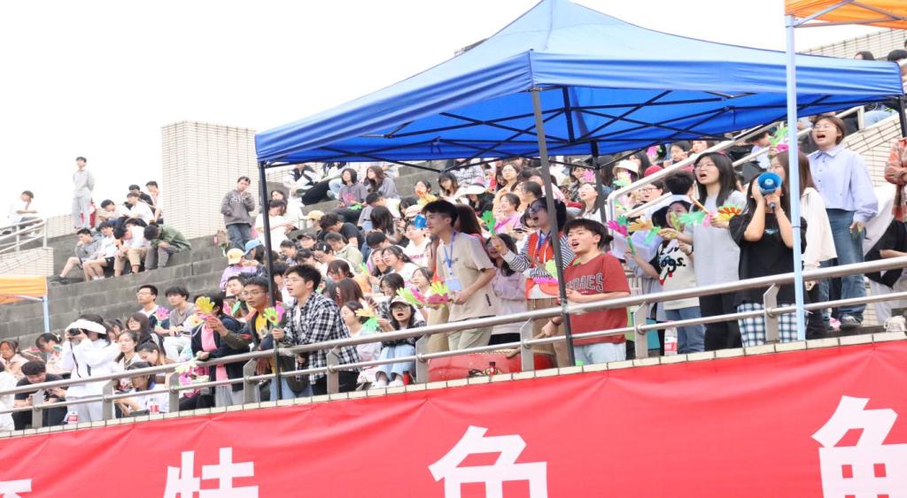 观众席上,掌声雷动,划破长空。声声助威,拉满运动氛围,激昂的呐喊声是他们发自内心的欢呼。尽管处于烈日之下,同学们依旧热情高涨,振臂高呼,鼓声阵阵,为经管健儿们注入无穷的力量和动力。当经管健儿冲过终点线的那一刻,他们放声高呼,为之自豪,展现出同学们的集体主义精神。