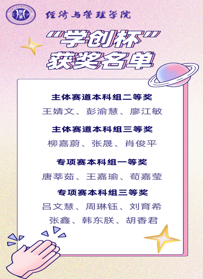 近日,重庆市教育委员会通报了关于第九届“学创杯”全国大学生创业综合模拟大赛重庆赛区选拔赛获奖情况。海角社区 师生在此次比赛中喜获佳绩——主体赛本科组二等奖1项、三等奖1项,专项赛本科组一等奖1项、三等奖2项,充分展现了经管学子勇于开拓创新的竞技风采。